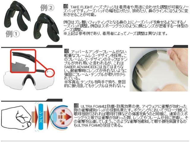 重圧度衝撃を受けたアイウェアは顔部に押し当てられ、レンズが眼球を圧迫してしまう。SABER ADVANCEDには、これを防ぐためにレンズ上部に耐衝撃緩和パッドとなるULTRA-FOAM™を実装し、SELENITE™レンズ形状+TAKE-FLIGHT™ノーズ+ULTRA-FOAM™によって重圧度衝撃時にレンズによる眼球圧迫を抑止する。