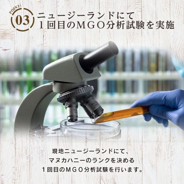 MGO(食物メチルグリオキサール)は、マヌカハニーに含まれる天然成分で、品質の目安として国際的に使用されています。MGO255以上とは、1kgあたり255mg以上のMGOが含まれていることを示します。