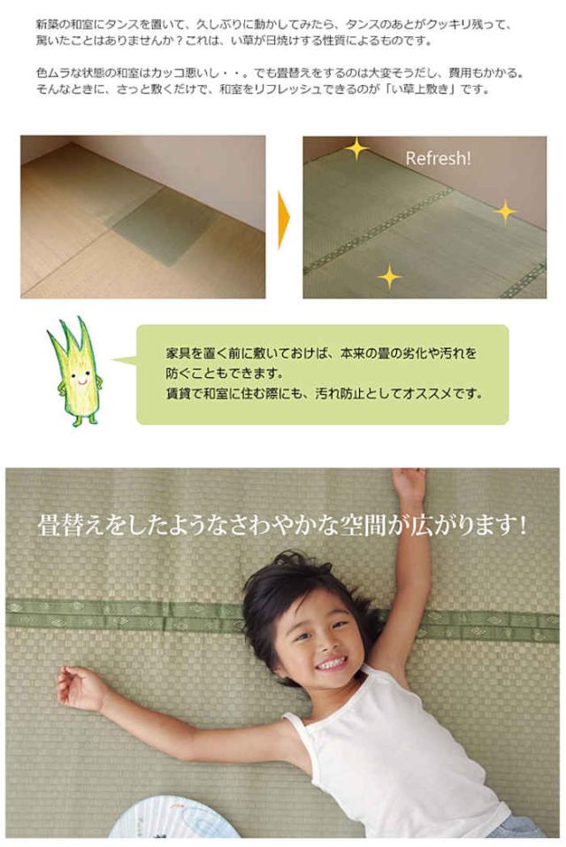 い草 イ草 いぐさ 上敷き 天然素材 自然素材 調湿 消臭 空気浄化 抗菌 防臭 ラグ カーペット マット ラグマット 敷物 敷き物 畳 ござ 汚れ防止 日焼け防止 インテリア 快適 リラックス リラクゼーション 癒し 新築 新居 新生活 新社会人 就職 新学期 進学 入学 引越し 引っ越し 転居 一人暮らし 準備 必需品 必要なもの プレゼント ギフト 贈り物 新築祝い 引越し祝い お部屋改造 DIY 模様替え プチリフォーム イメージチェンジ イメチェン カスタム ペット フロア 床 床材 床上 マンション アパート フローリング おしゃれ 日本製 国産 純国産 両面 リバーシブル イケヒコ