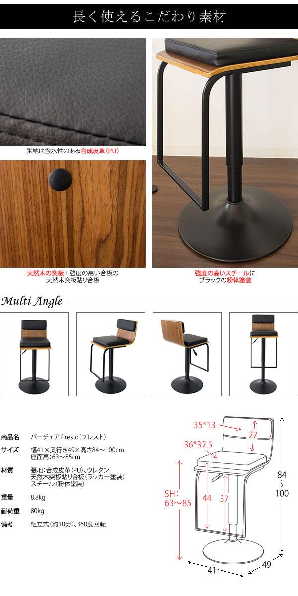木目が美しい天然木突板を使用した木板の座面フレームに、中にウレタンの詰まった肌触りの良い合成皮革を背もたれと座面に配したバーチェアは座り心地もバツグン♪