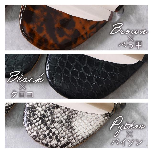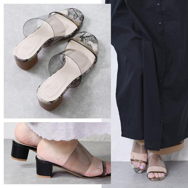 今年らしさをたっぷり漂わせた涼しげな抜け感のあるクリアサンダル。暖かな日差しが差し込み、気分高まるこれからの季節にもってこい♪つま先から垣間見えるパイソン、べっ甲、クロコの生地がコーディネートのアクセントに。甲ストラップには痛くなりにくい柔らかいクリア素材を使用。ヌーディーな足元をつくる大人可愛い1足です。