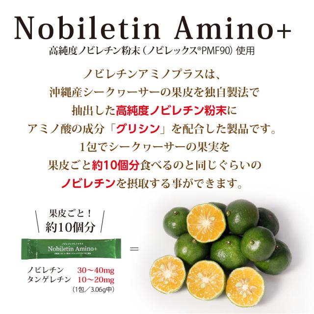 ノビレチンアミノプラスは、沖縄産シークヮーサーの果皮を独自製法で抽出した高純度ノビレチン粉末にアミノ酸の成分「グリシン」を配合した製品です。