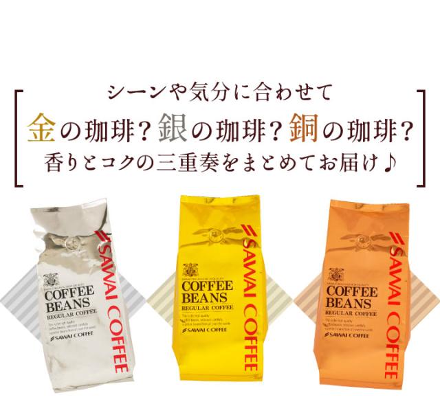 | こんな方にオススメです | 飲み比べを楽しみたい方へ:金、銀、銅の3種類の味わいが飲み比べができますので毎日のコーヒータイムをバラエティ豊かに楽しみたい方に最適です。 新鮮なコーヒーが好きな方: 澤井珈琲は焼きたてコーヒー専門店だから、いつでも新鮮な味を楽しめます。 家族やオフィスで飲む方: 大容量のパッケージなので、みんなで楽しめます。 |