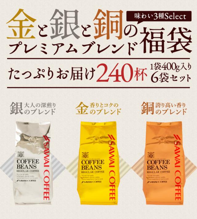 【澤井珈琲】金と銀と銅の珈琲 3種 240杯 分 福袋 ソルブレンド ルナブレンド テルスブレンド(コーヒー/コーヒー豆/2.4kg/珈琲/珈琲豆/コーヒー粉/粉)