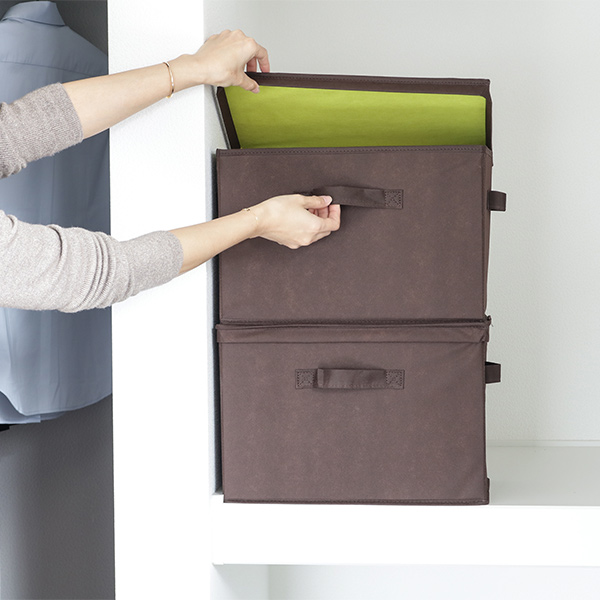 不織布なのに積み重ね収納できるフタ付き整理箱です。芯材が入ったしっかりとした設計で、3段まで積み重ねることができます。クローゼットや押し入れの空間を有効活用できます。フタ付きなので、大切な収納物をほこりから守ってくれます。