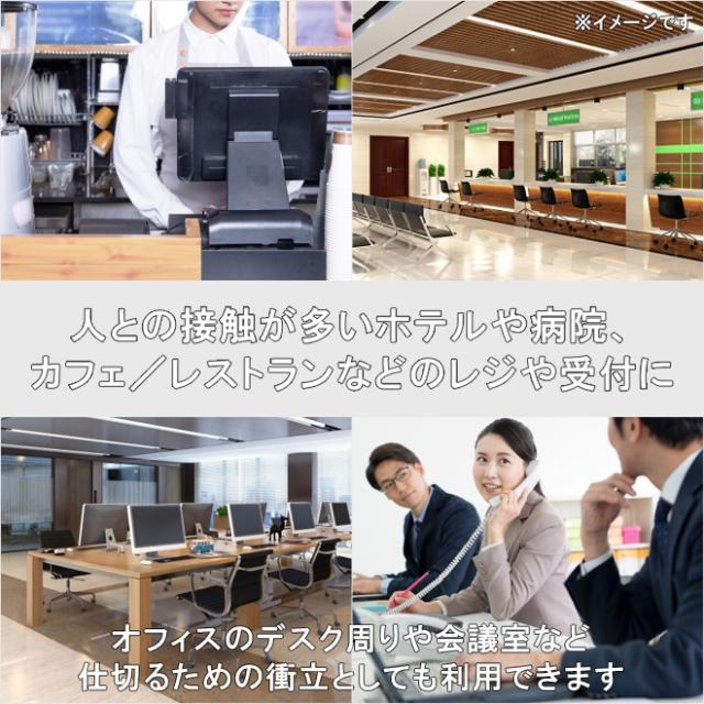 飛沫防止に!簡単設置できるパーテーション ●手軽に飛沫感染の防止対策が行える、簡易組み立て式パーテーションです ●ホテルや病院/カフェやレストランなど、人との接触が多いレジや受付等の対面での 飛沫防止におすすめ オフィスのデスク周りや会議室など、席と席との間を仕切るための衝立としても 利用できます ●高透明度のアクリル板を使用しているので圧迫感もなく、相手の顔を見ながら 自然なコミュニケーションが可能です ●お金や商品、書類の受け渡しができる窓が付いているので便利です ●極厚5mm、900×600mmの大型アクリル板で広範囲の飛沫を効果的に防ぎます 板の角は丸く加工してあるので、安心です ●大きなスタンドでアクリル板を支えるので、倒れにくく安定感があります ●工事や取付け加工も不要 スタンド2個にアクリル板をのせるだけの簡単設置で、届いたその日からすぐに ご使用いただけます ※お届け時は両面に保護フィルムが貼ってあります 綺麗に剥がしてからご使用ください 品番:SET-AP-900 |