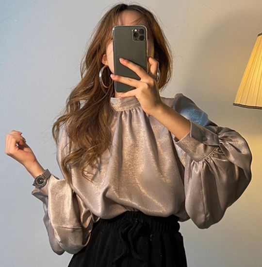 トップス ブラウス おしゃれ シンプル ゆったり 白 黒 グレー 無地 ハイネック 長袖 バルーン袖 春 秋 背中開き 光沢 フェミニン 大人可愛い 10代 20代 30代 お出かけ デート お呼ばれ パーティー ディナー 女子会 上品 トレンド