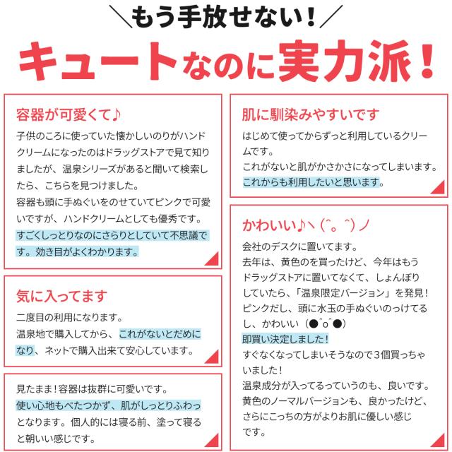 成分/水、グリセリン、ステアリン酸グリセリル、セタノール、ミリスチン酸イソプロビル、ミネラルオイル、ソルビトール、セテス-15、温泉水、スクワラン、馬油、アロエベラエキス-1、パラフィン、ステアリン酸、ジメチコン、ステアリン酸グリチルレチニル、ステアラミド、ステアリン酸ソルビタン、セチル硫酸Na、ラウレス-9、BG、PVP、セテス-10、プロピルパラベン、メチルパラベン、トコフェロール、フェノキシエタノール