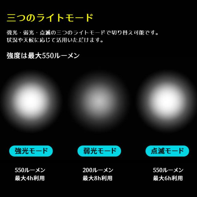 *強・弱・点滅の3つのモードはボタンでかんたんに切り替えられるので、状況や天候に応じて使い分けも簡単!