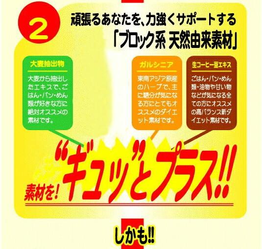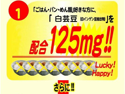 白インゲン豆エキス末、とうもろこしでん粉、澱粉分解物、バナバ葉エキス末、ガルシニアエキス末、生コーヒー豆エキス末、ミネラルイースト(亜鉛、マンガン、銅、ヨウ素、セレン、クロム、モリブデン含有)、ヒバマタ抽出物、ブドウ種子抽出物/プルラン(被包材)、ショ糖エステル、ビタミンC、ナイアシン、パントテン酸Ca...他