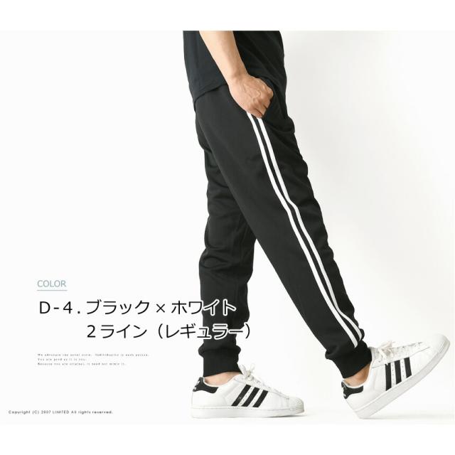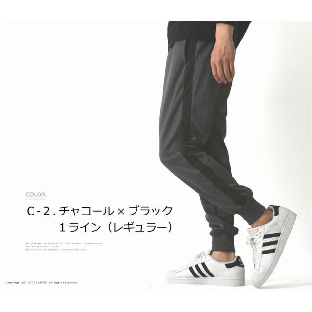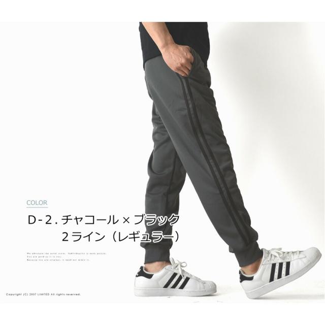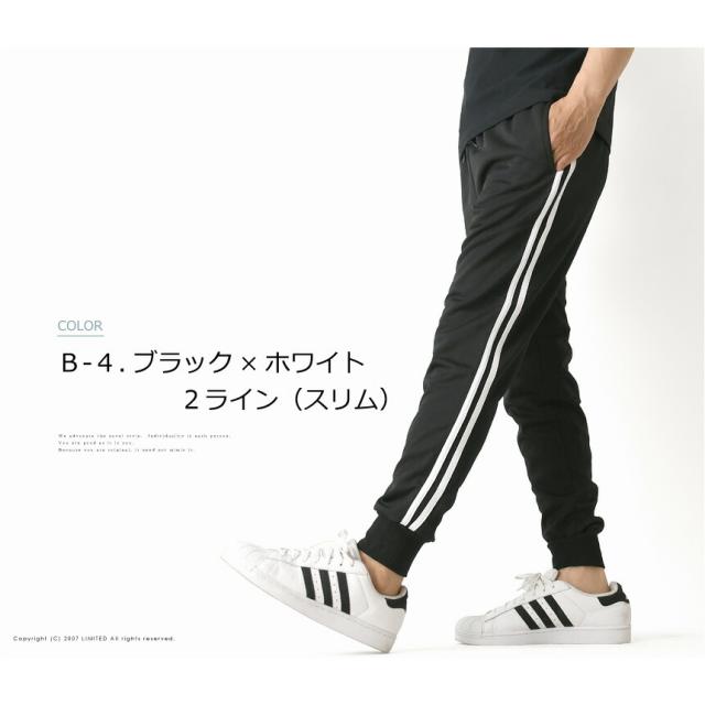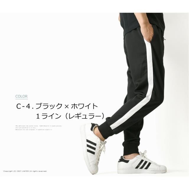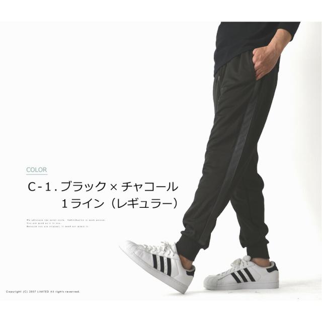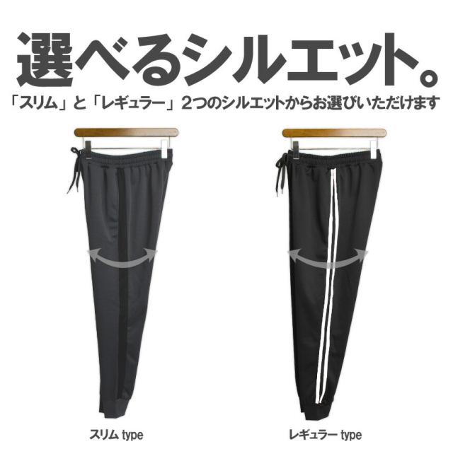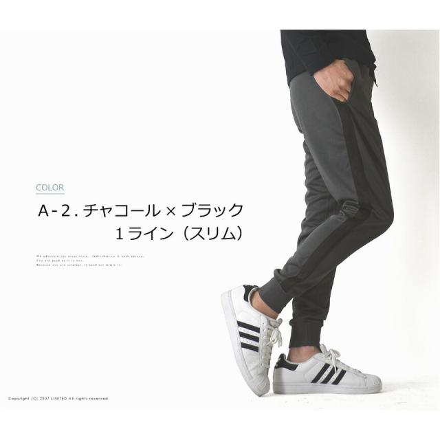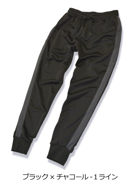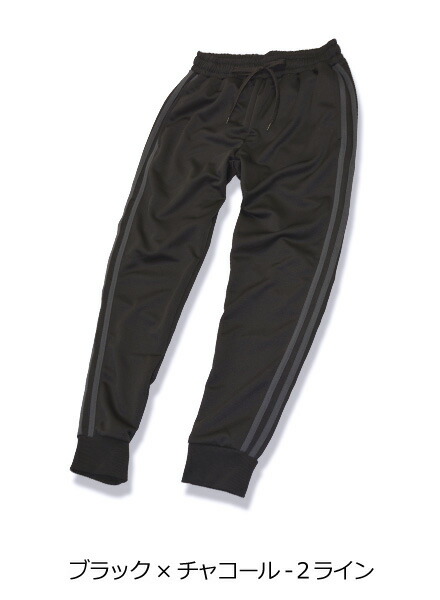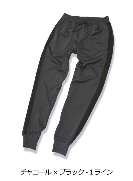 トレンドでもあるサイドラインと裾がリブ仕様になったジョガータイプがポイント。