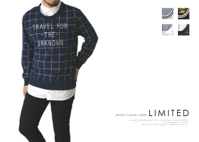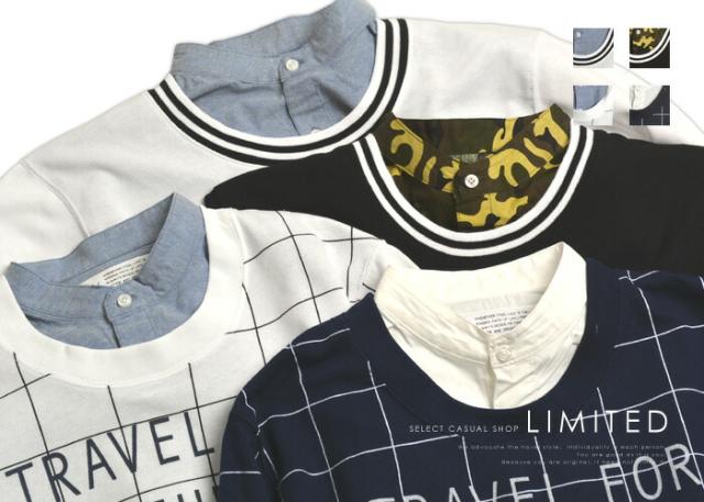 トレーナーとバンドカラーのシャツを重ね着したように見えるフェイクレイヤードデザイン。