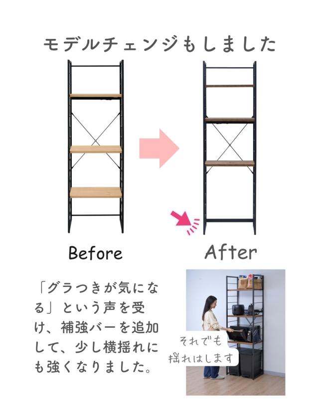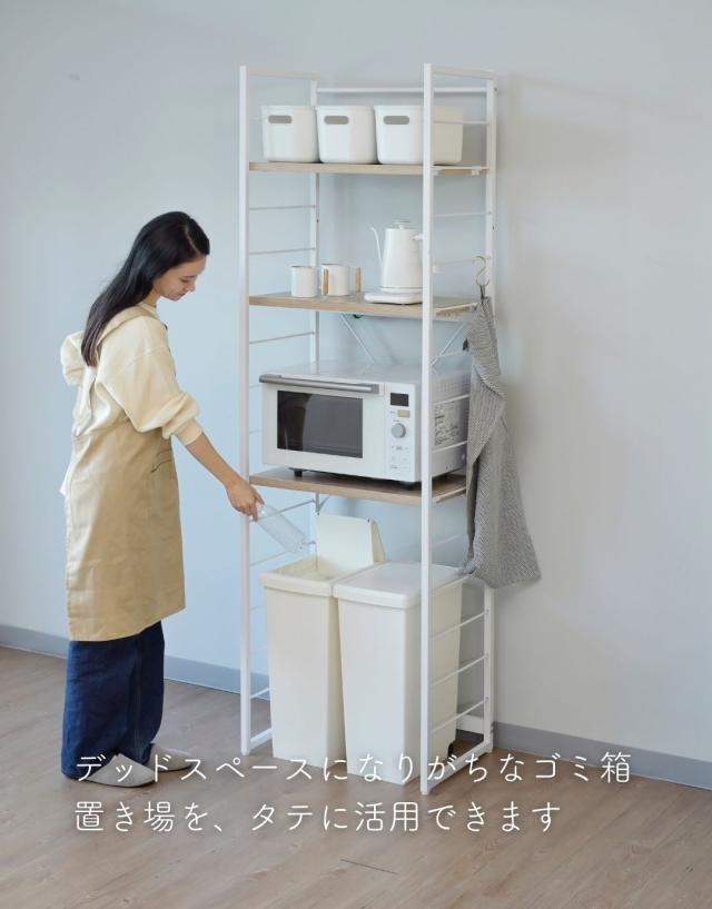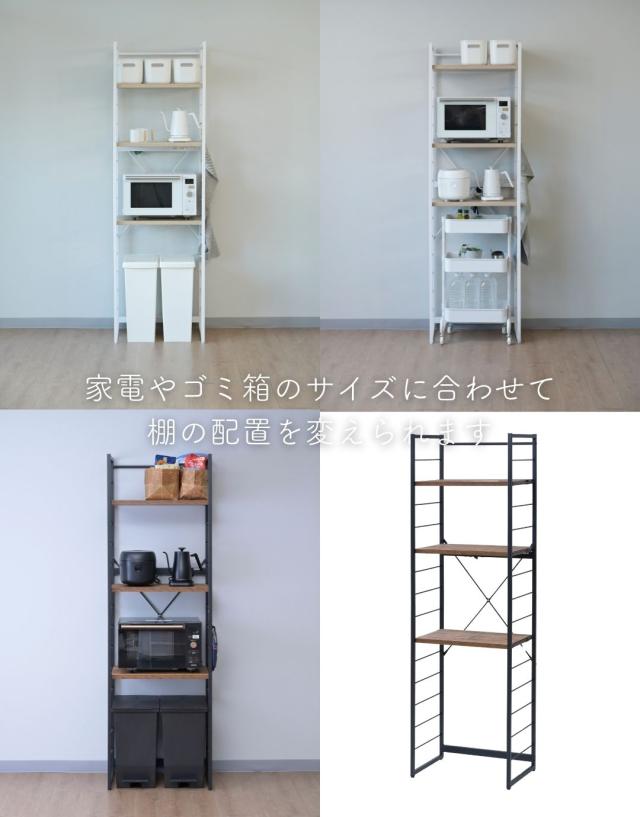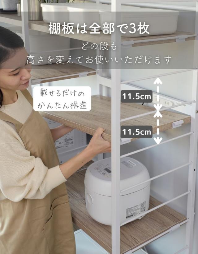 | 商品説明 | ※2024年10月15日より、補強桟を増やした新タイプを追加します。 ※冷蔵庫上にも使えるオープン構造のため、設置環境によっては商品の横揺れが生じます ●冷蔵庫やゴミ箱の上を活用する収納ラック ●2口コンセント付き(計1500Wまで)でよく使う家電や雑貨をすっきりひとまとめ ●キッチンを邪魔しないシンプルデザイン ●棚やコンセントの高さを、モノに合わせて変更可能 ●棚板を載せる、組み立て簡単構造 ※冷蔵庫上にも使えるオープン構造のため、設置環境によっては商品の横揺れが生じます ●棚板は傷や汚れに強い樹脂加工仕様 ●フレームは、インテリアを邪魔しないツヤのないマット仕上げ ●可動式棚板3枚、厚さ2.5cm ●棚板高さ:(最下段時)13.5cm、約11.5cm間隔・14段階調節 ●棚板サイズ:幅55.5 奥行35.5cm ●コンセントバー位置:床から103、127、151.5cm(3段階選択可能) ●耐荷重:棚1枚あたり25 全体75kg |