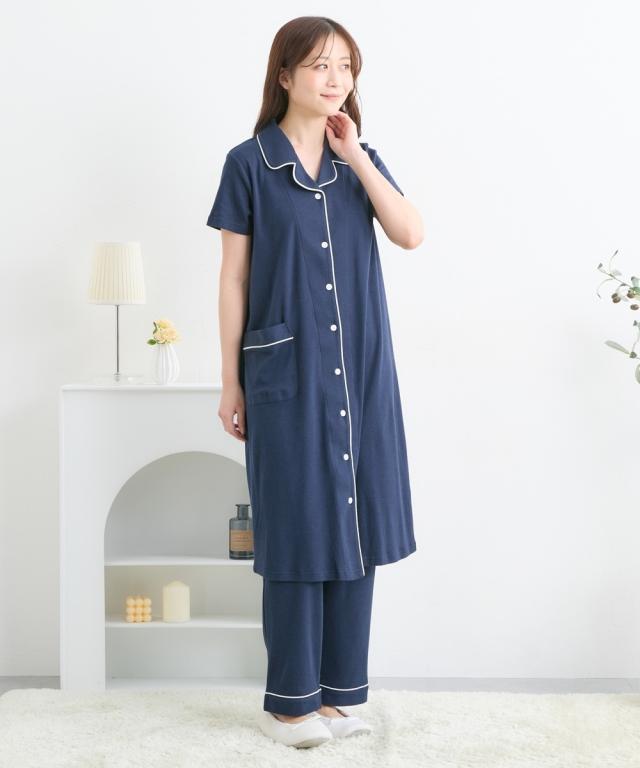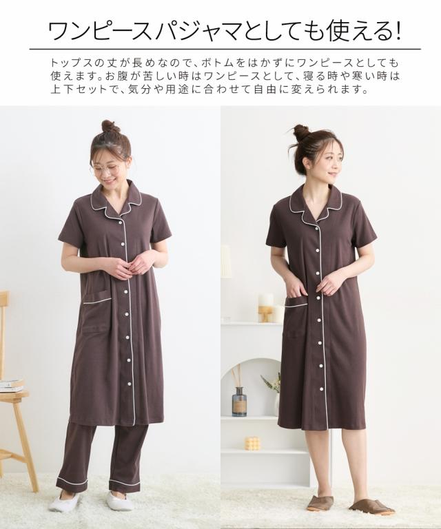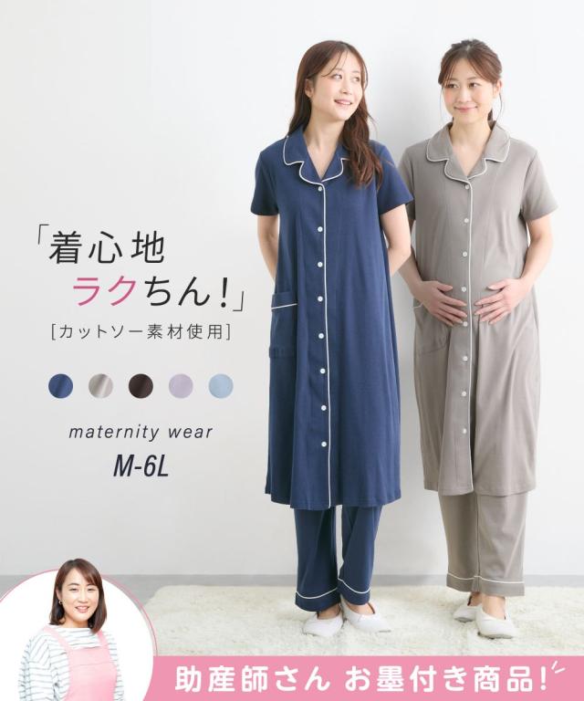 衿付でキチンと感がありながら、カットソー素材でやわらかく、着心地ラクチン 長めの着丈なのでパンツなしでの着用もOKです。 前ボタン開きなので、入院時の診察にも便利。 上から2つ目、3つ目はスナップボタンなので、赤ちゃんを抱っこしたまま片手でカンタンに開けられます。 一番上のボタンは普通のボタンなので、片手でスナップボタンをはずしても全開にならず、さっと授乳口ができるのがうれしいですね。 前開き授乳タイプなので、産後、授乳期以降もパジャマとして使いやすいです。 パンツはボタン付のゴム仕様でウエスト調節が簡単にできます。 出産準備にもぜひどうぞ。 ・産前から産後に使う ・授乳機能付(前ボタン) ・パンツ:ウエスト調節可 ・夏素材