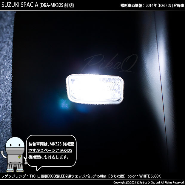ピカキュウ,LED専門店,LEDバルブ,LED,SMD,T10,W5W,日亜化学工業,日亜,3030,ルームランプ,カーテシ,バニティ,爆光,150lm,150ルーメン,ROOM,スズキ,スペーシア,SUZUKI,SPACIA,MK32S,前期