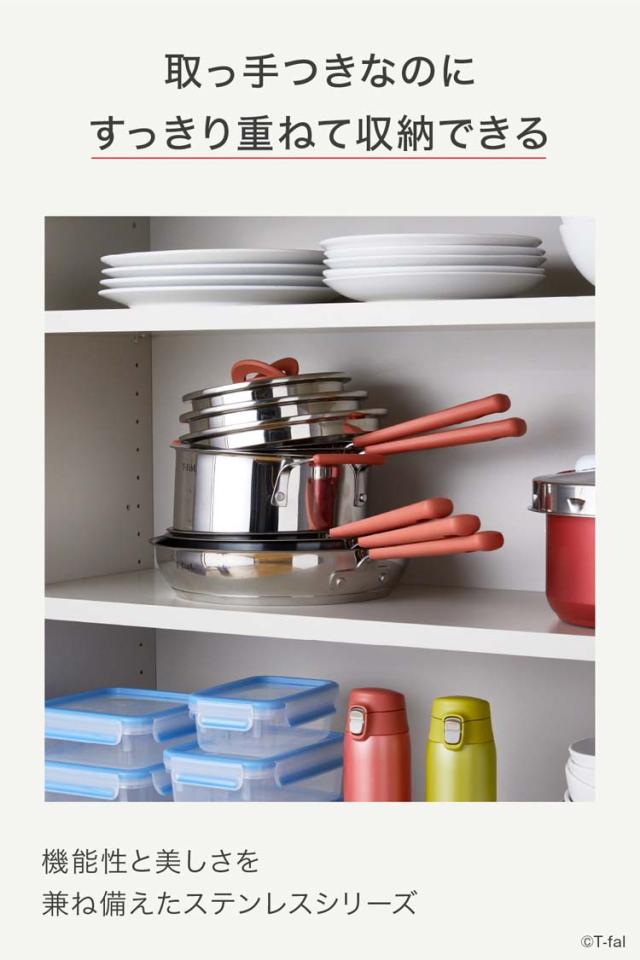 同シリーズのフライパン、ソースパン、シチューポットと異なるアイテムを重ねることができます。