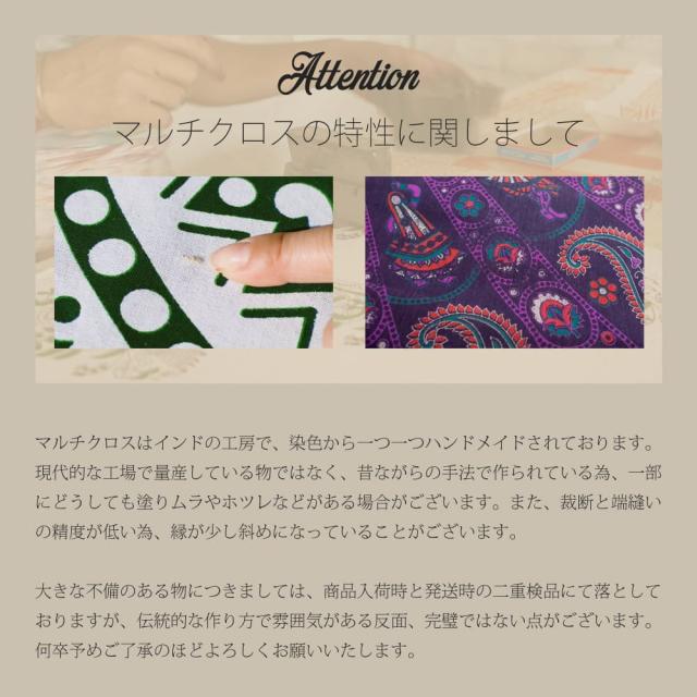 | 備考 | こちらの商品は、インドで昔ながらの製法で手作りされております。その為、端縫いの不具合、多少のほつれや汚れ、色落ちがある場合がございます。人の手で作ってくる為、若干のプリントズレや塗料が少し飛んでいることがございます。また、インドで白系の布には、宿命的に若干の汚れがございます。一般的な物と比べれば状態は良いですが、その点も含め予めご了承いただけますと幸いです。 |