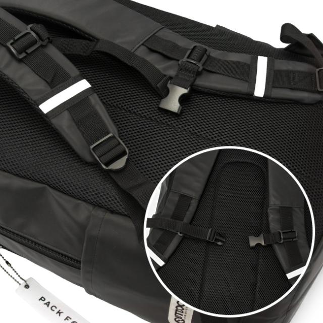 背面は蒸れを軽減するメッシュパネルと、肩からずり落ちるを防いでくれるチェストベルトを完備しております。夜間の安全性をサポートしてくれるリフレクターも装備。