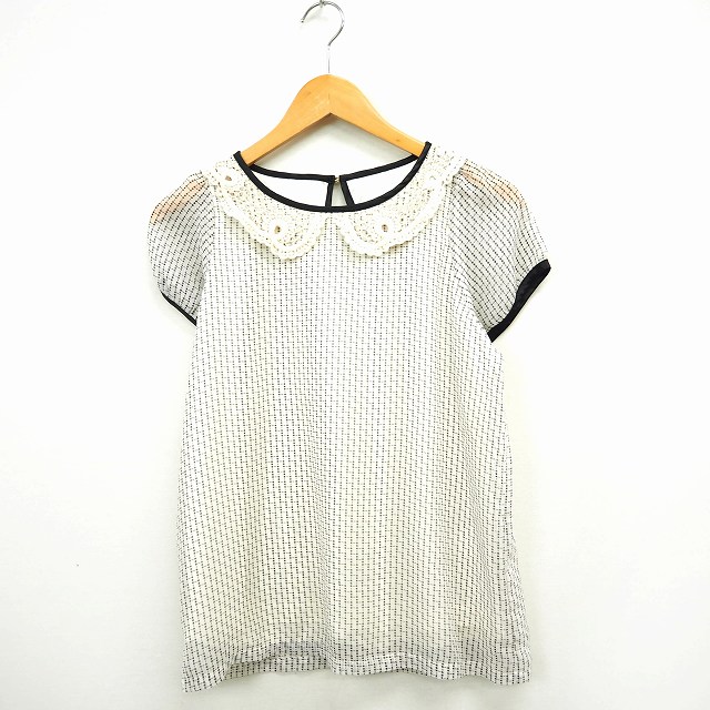 【中古】ヒアーズ HERE'S シャツ ブラウス レース 総柄 丸首 半袖 コットン 綿 38 アイボリー ブラック 黒 レディース