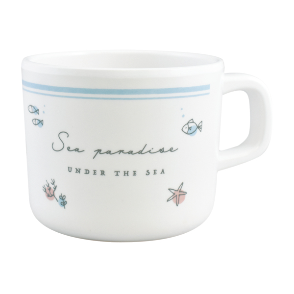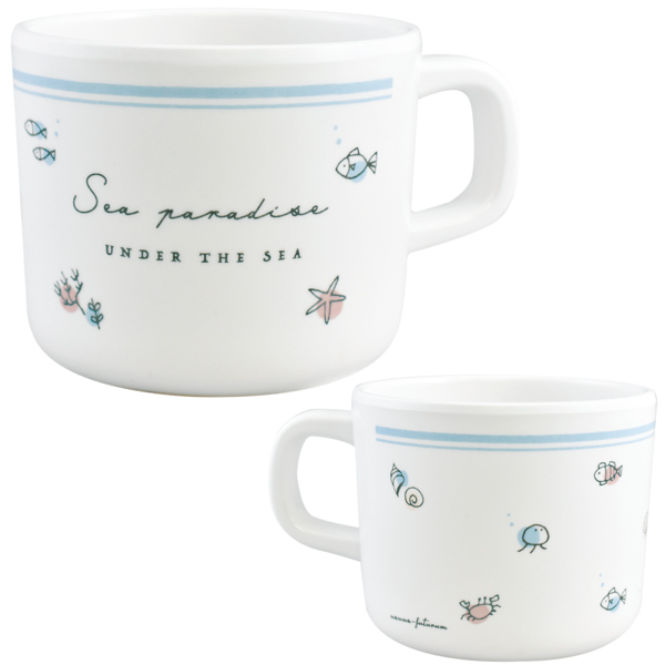 淡いパステルカラーにたくさんの海をイメージしたデザインが描かれたメラミンマグカップです。軽くて、落としても割れにくい樹脂製なので、お子さまの日常使いや幼稚園・保育園用に最適です。ご自宅などで使うのはもちろん、ピクニックやキャンプなどのアウトドア食器として使うのもおすすめです。