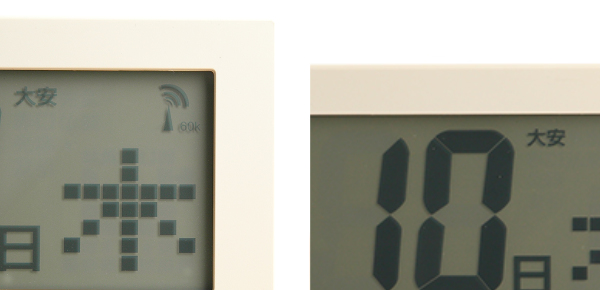 | 電波表示 いつも正確な時刻がわかる電波時計です。右上に電波の受信状況が表示されます。 | 六曜表示 大安や仏滅などがわかる六曜は2050年まで表示されます。 |