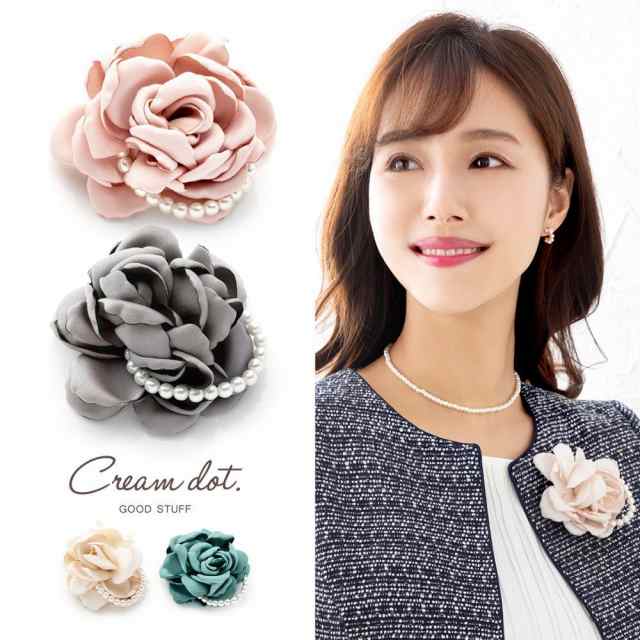 程よい光沢の花弁がたっぷり重なったフラワーモチーフに、パールラインが飾られた上品なコサージュ。