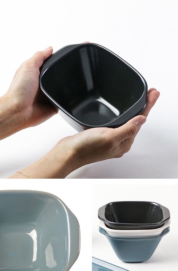 ほっこりした印象のくすみカラーがおしゃれな無地デザインです。ホワイト、ブルーの表面はつるつるとした艶仕上げ、ブラック表面はさらさらとしたマット仕上げです。両端にリムのあるデザインで持ちやすく、重ねられるので、複数遣いでもかさばりません。