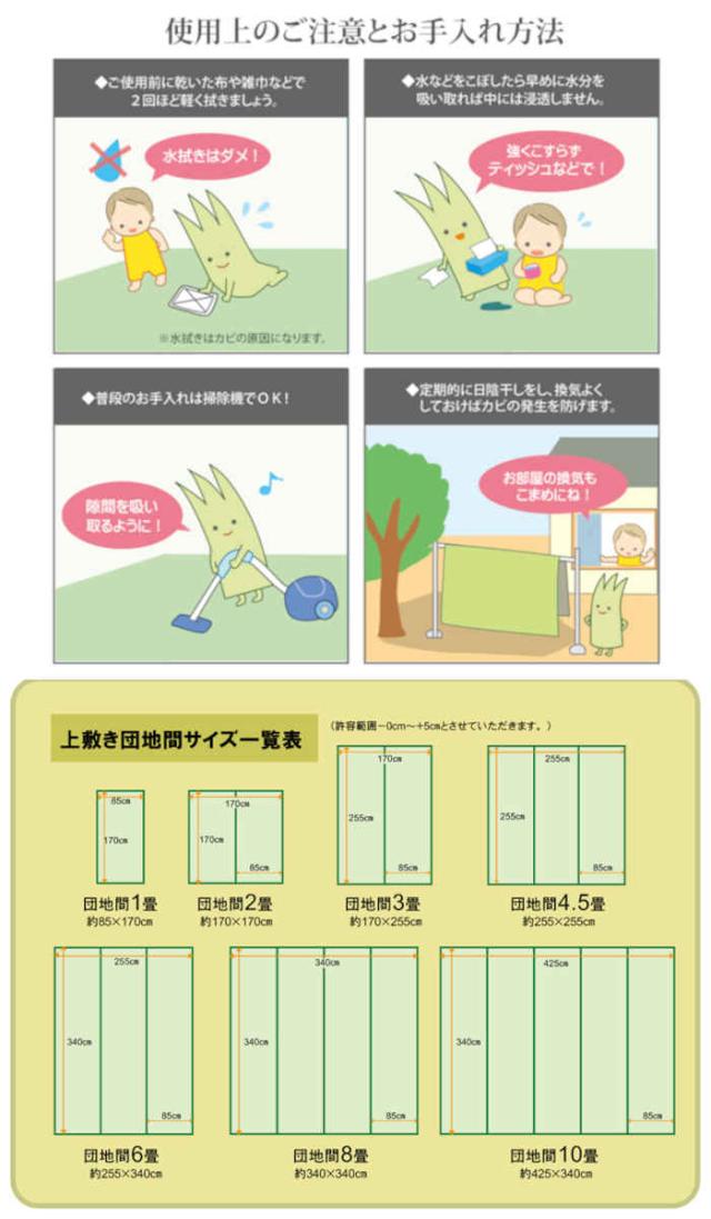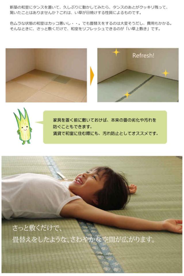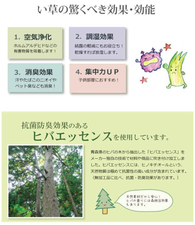 上敷きを敷くだけで畳のお部屋をリフレッシュ出来ます。日焼けしてしまった畳のリフレッシュに、新品の畳を汚さないためのカバーにご使用下さい。長さ105〜110cmの国産(九州産)い草を使用しています。そのうち約85cmを使用しています。ヘリ際はある程度白みを帯びます。(日焼けではありません、い草の根元と先端部分の色です。)い草は長いものほど高級になります。い草は先端部分が赤茶色く、根元が白く真中が青(緑)色です。真中の良質な青の部分を多く使用するほど、丈夫で綺麗な仕上がりとなります。またイ草は使用するうちに日焼けをしますが、真中の青の部分を多く使用したものほど、全体が綺麗にムラなく日焼けし、味が出ます。国産(九州産)のい草を使用しています。国産い草は一本一本が太く、表皮が厚く繊維がキメ細かいので弾力性があり、耐久性に優れています。い草には空気の清浄化作用、湿度の調節作用があり、汚れにくいといった特徴があります。い草に青森ヒバ加工を施しています。(抗菌、防臭効果)表裏の両面が使えて経済的です。