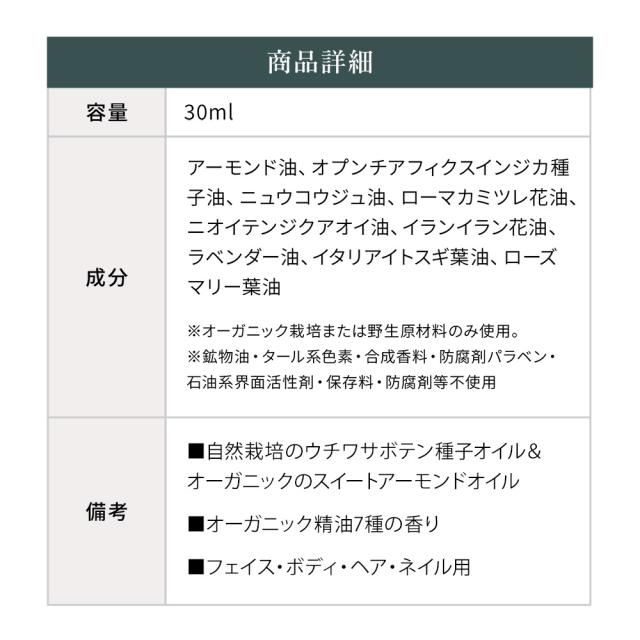 原材料:アーモンド油、オプンチアフィクスインジカ種子油、ニュウコウジュ油、ローマカミツレ花油、ニオイテンジクアオイ油、イランイラン花油、ラベンダー油、イタリアイトスギ葉油、ローズマリー葉油