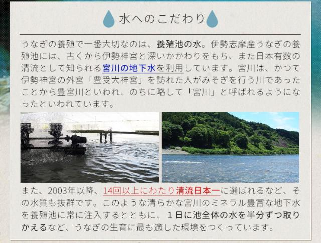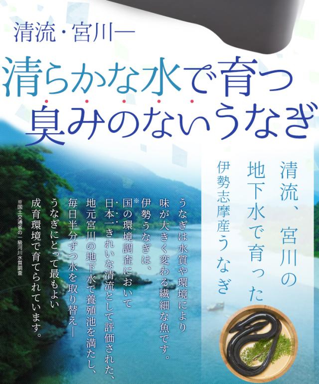 うなぎ 伊勢神宮のみそぎ川宮川の水で育つ伊勢志摩産のうなぎを厳選 地場産のたまり醤油を使用したタレで焼き上げ