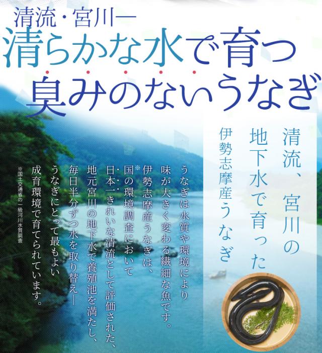 うなぎ 伊勢神宮のみそぎ川宮川の水で育つ伊勢志摩産のうなぎを厳選 プロの焼き加減でふっくらジューシーに焼き上げ