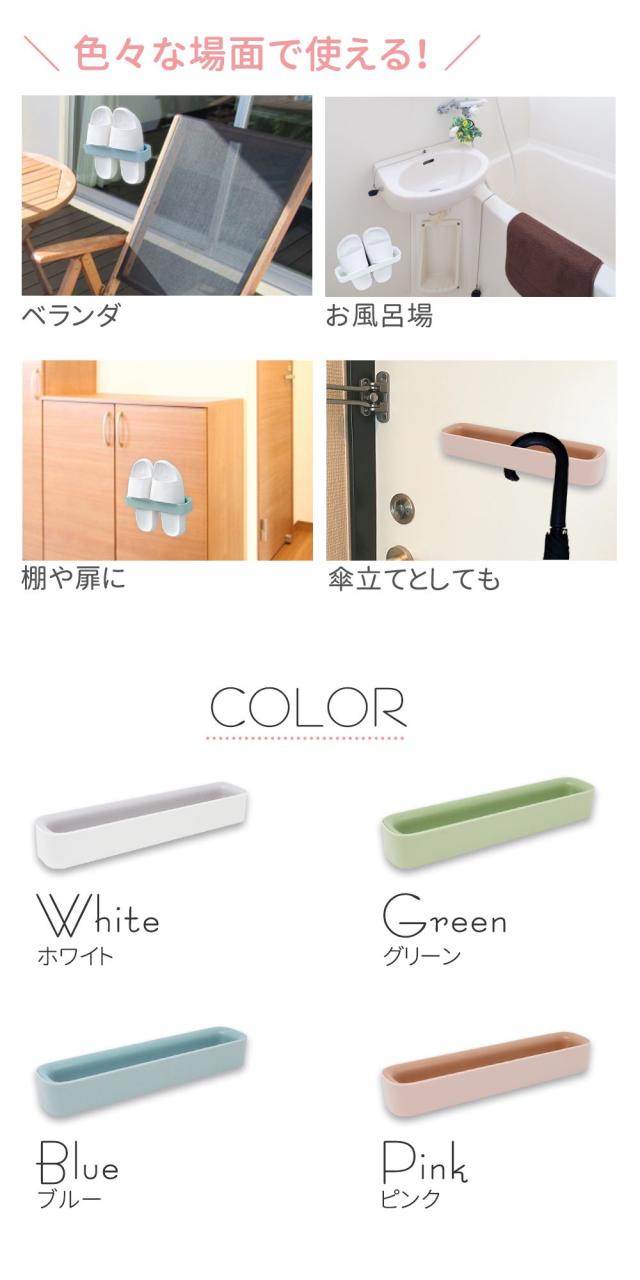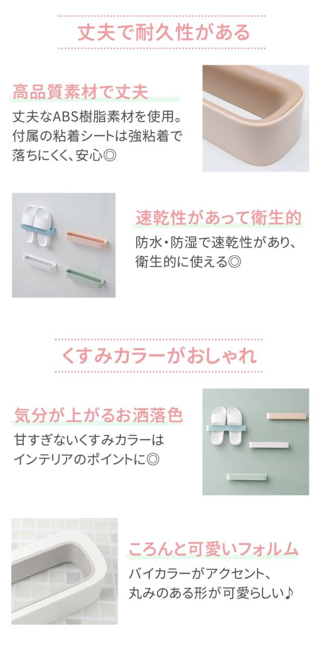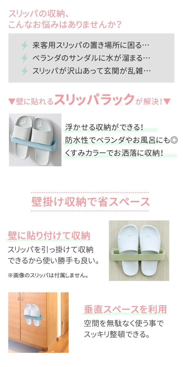 スリッパ/スリッパラック/ラック/収納/スリッパ収納/壁/壁掛け/壁掛けラック/浮かせる収納/粘着/粘着シール/省スペース/スッキリ整頓/整理/整頓/耐久性/丈夫/ABS/ABS樹脂/落ちにくい/速乾性/衛生的/防水/防湿/くすみカラー/フォルム/かわいい/おしゃれ/ベランダ/お風呂/棚/扉/傘立て/ホワイト/グリーン/ブルー/ピンク/引っ掛け/引っ掛け式/玄関収納/玄関/スリッパ立て/ルームシューズ/来客用/下駄箱/スリッパ置き場/スリッパホルダー/シンプル/北欧/くっつく/コンパクト/アイデア/会社/オフィス/家/店舗/diy/