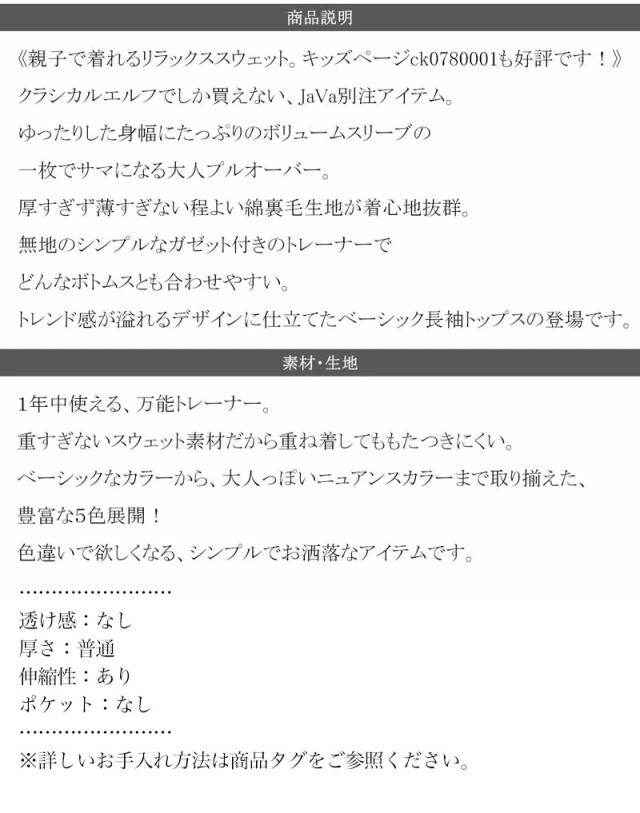 ![]() ![]() ![]() ![]() ![]() ![]() ![]() ![]() ![]() ![]() ![]() ![]() ![]() ![]() ![]() ![]() ![]() ![]() ![]() ![]() お子様とお揃い♪親子コーデも楽しめる!! キッズアイテムはこちら!!! ![]() ★【親子コーデ】【JaVaジャバ コラボ】ビッグシルエット裏毛長袖トレーナー★ シンプルながら計算し尽されたシルエットが魅力。 ゆるっと着こなせる、ラフでお洒落なビッグシルエットトップス。 《親子で着れるリラックススウェット。キッズページck0780001も好評です!》 クラシカルエルフでしか買えない、JaVa別注アイテム。 ゆったりした身幅にたっぷりのボリュームスリーブの一枚でサマになる大人プルオーバー。 厚すぎず薄すぎない程よい綿裏毛生地が着心地抜群。 無地のシンプルなガゼット付きのトレーナーでどんなボトムスとも合わせやすい。 トレンド感が溢れるデザインに仕立てたベーシック長袖トップスの登場です。 左裾のお洒落なJavaブランドロゴがさりげないアクセントに。 お手持ちのデニムやスキニーパンツを合わせれば、間違えなしの簡単めりはりコーデが完成。 レビュー商品の評価: