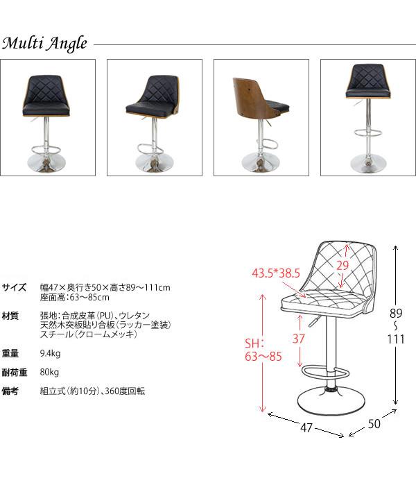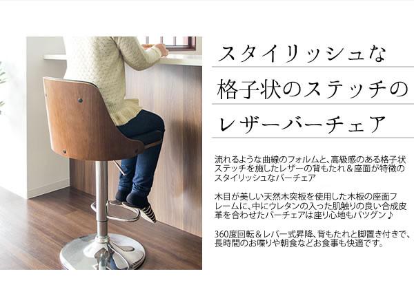流れるような曲線のフォルムと、高級感のある格子状ステッチを施したレザーの背もたれ&座面が特徴のスタイリッシュなバーチェア。