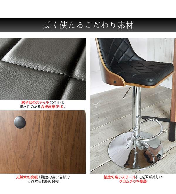 木目が美しい天然木突板を使用した木板の座面フレームに、中にウレタンの入った肌触りの良い合成皮革を合わせたバーチェアは座り心地もバツグン♪