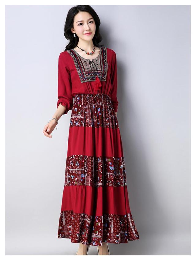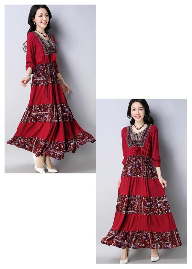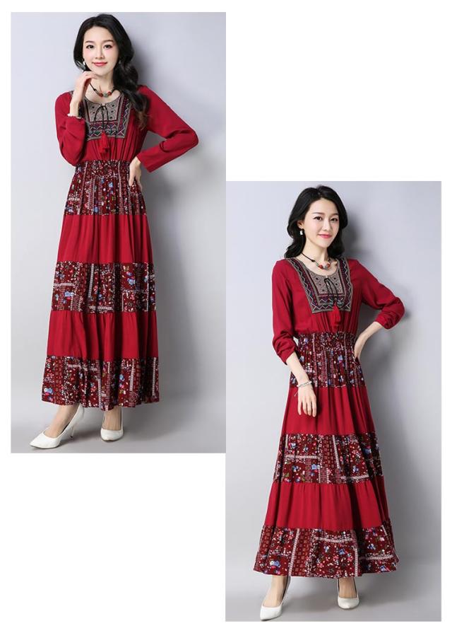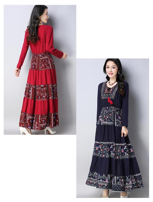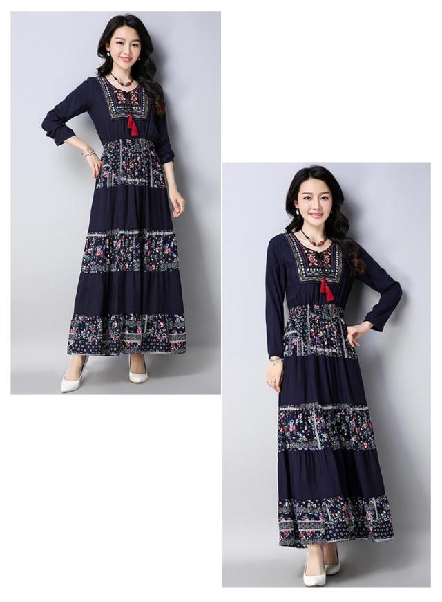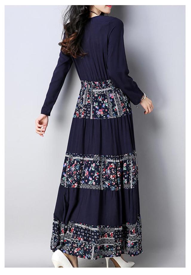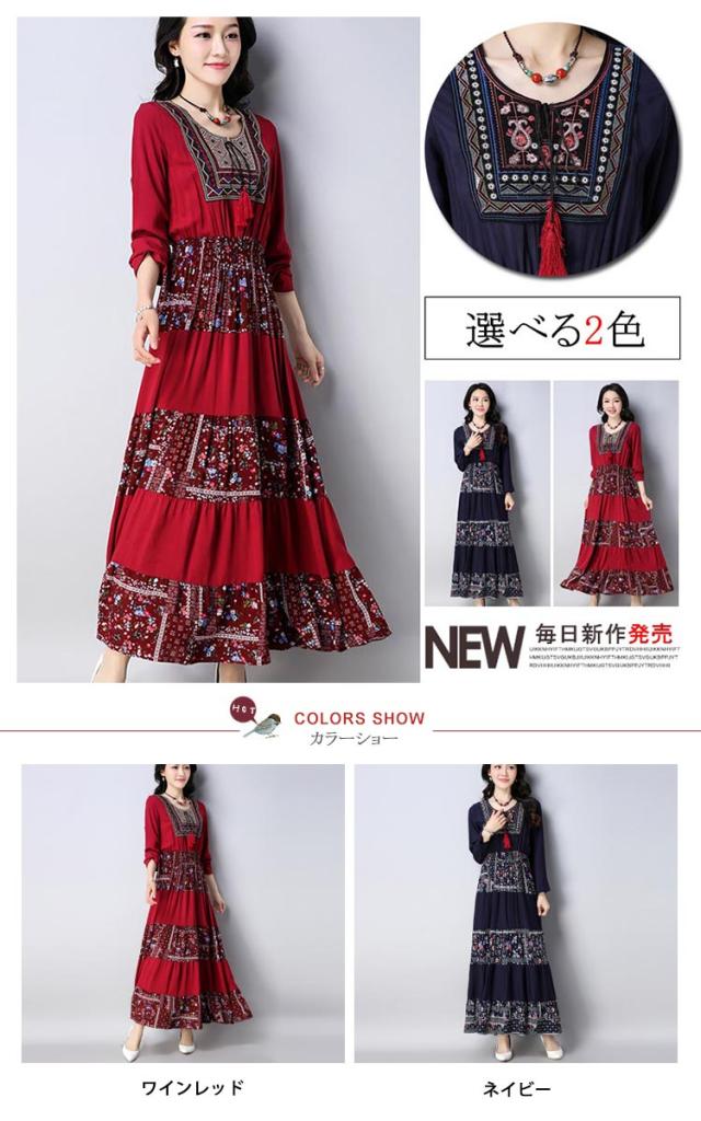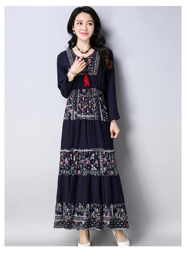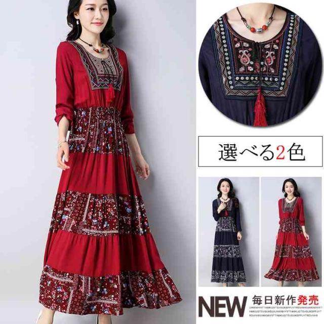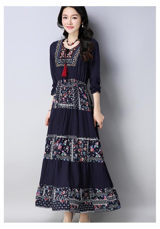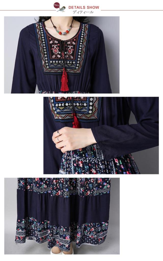 ワンピースマキシワンピ マキシロング丈 長袖 花柄 民族風春 紺 レディース