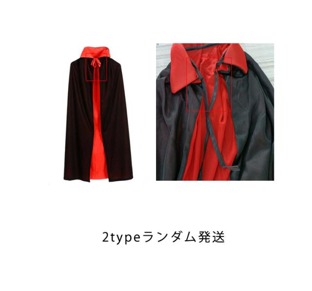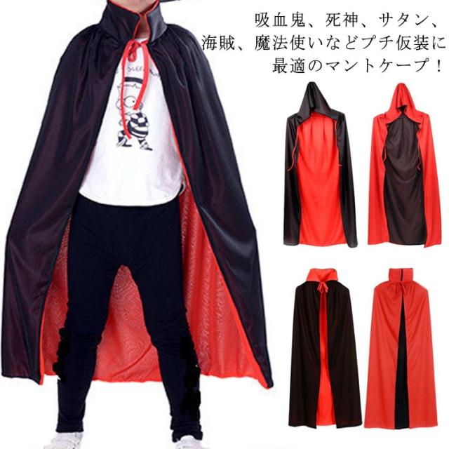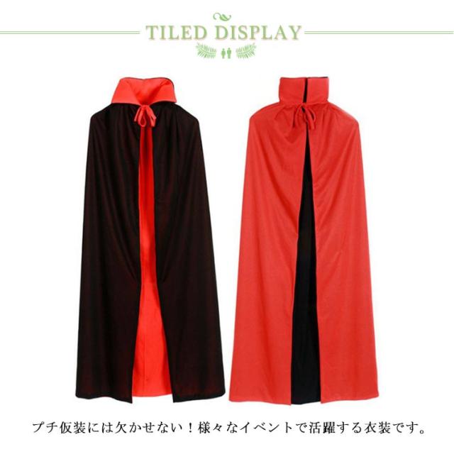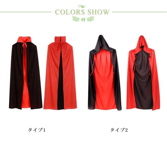| 吸血鬼、死神、サタン、海賊、魔法使いなどプチ仮装に最適のマントケープ! 赤黒のリバーシブルになっているので、ちょっぴり華やかに。 いつものスタイルに1枚羽織るだけで、お手軽にお得にコスプレが楽しめます。 プチ仮装には欠かせない!様々なイベントで活躍する衣装です。 襟付きとフード付きの2タイプから選べます。 | |