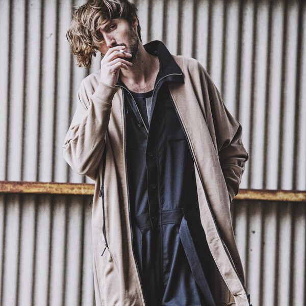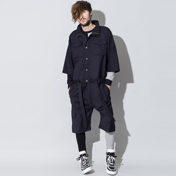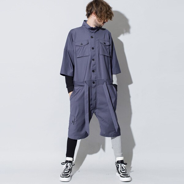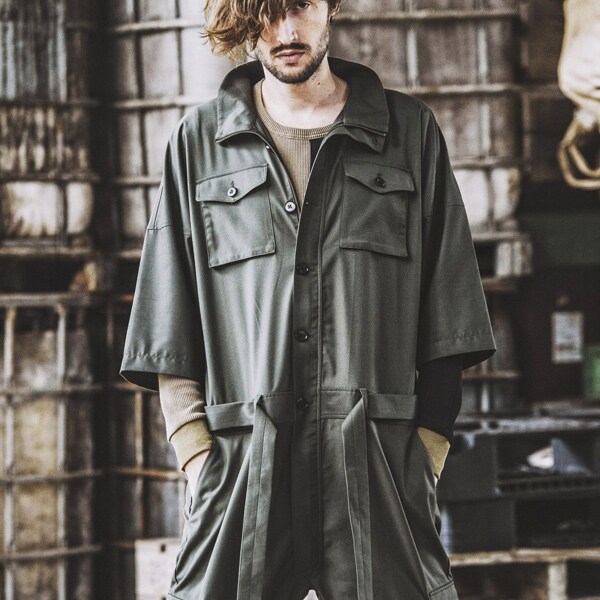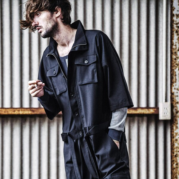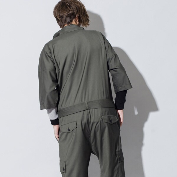 今までにはないビッグシルエット、ハーフスリーブ仕様の本作はオールインワンの武骨なイメージを払拭しテーラードジャケットなどに使われるTR素材を採用し丈夫で軽くシワになりにくく程よい艶感を持たせた上品な印象を持たせている。
