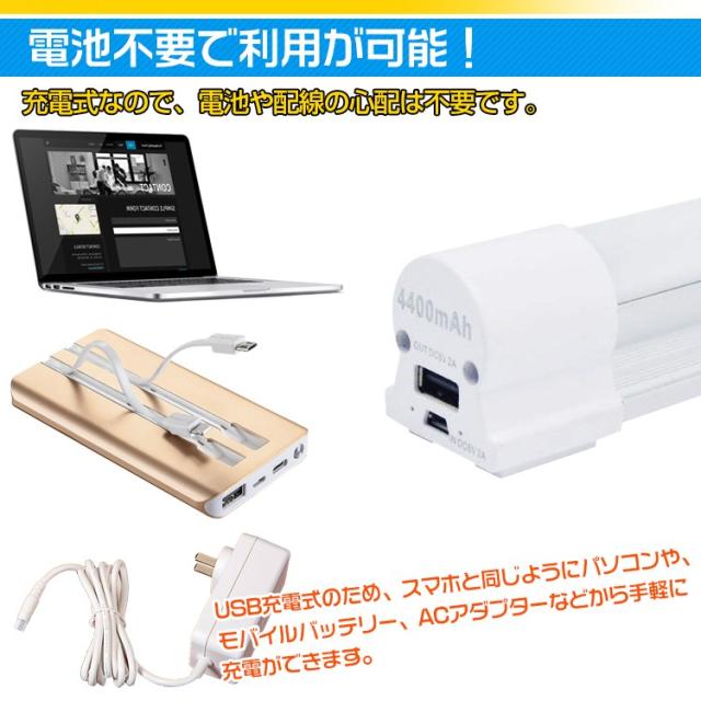 ■充電式なので、電池不要。パソコン、モバイルバッテリー、ACアダプターなどから手軽に充電ができます。