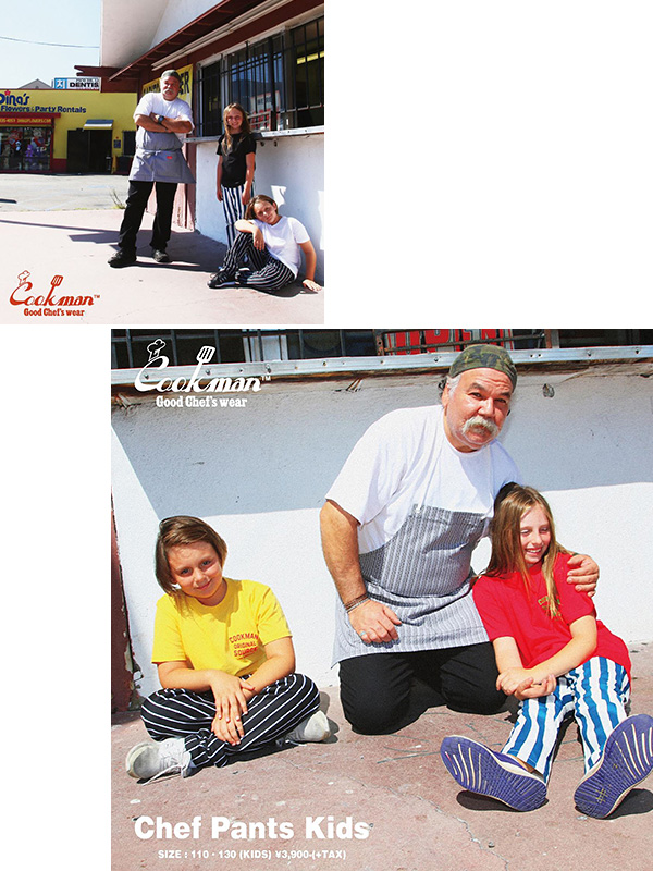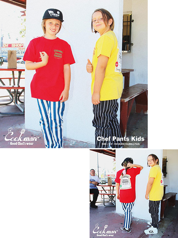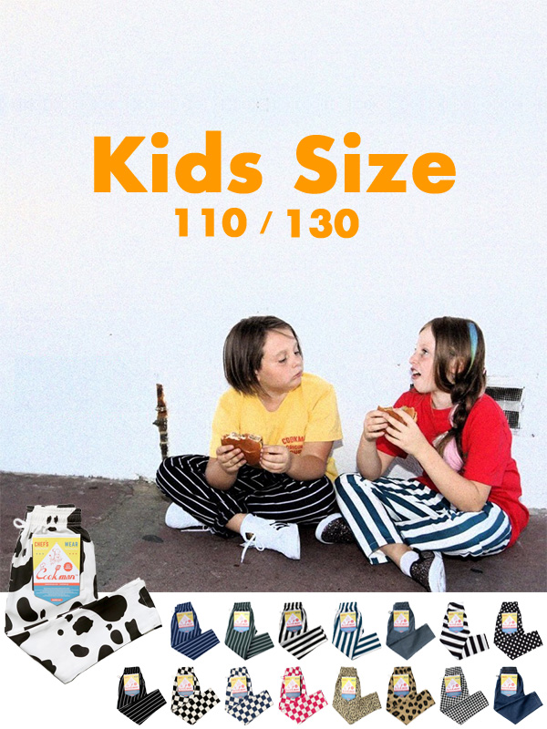 COOKMAN Chef Pants Kids Size クックマン シェフパンツ キッズサイズ 【COOKMAN(クックマン)】 アメリカ西海岸の料理人仲間が集まり話しました。 「僕らが普段キッチンで着用しているシェフパンツは機能的で動きやすいし快適だ!」 「でも料理をクリエイトするときもっとカッコいいウエアーは無いか?」 そんな彼らの要望を満たす為に生れたのがCookman wearです。 その後Cookman wearは、デザイン及び機能性の高さから彼らがキッチンで創作活動をする時のみならず、 Off Dutyの場面でも好んで使用され、one mile wearとしての地位が確立。 手ごろな価格とデザインの豊富さから、今では料理人の特別なアイテムではなく、 年齢や性別を選ばないNo Gender and Age gapなアイテムとして多くの人たちから支持されています。 ルーズテーパードシルエットのシェフパンツのキッズサイズです。 腰回りにゆとりをもたせたシルエットで、ウエストはゴムとドローコードを付属し、 履き心地にも優れたイージーパンツ仕様。 スポーティかつ、軽快に履きこなせるデザイン。 シンプルながら主張が感じられるアイテムです。 カラーバリエーションも豊富なので親子でお揃いのパンツが選べます。 STRIPE-BLACK(234-92866) / STRIPE-NAVY(234-83871) / STRIPE-DARKGREEN(234-83873) WIDE-STRIPE-BLACK(234-92868) / WIDE-STRIPE-NAVY(234-83882) / HICKORY-NAVY(234-92864) BORDER-BLACK(234-83887) / DOTS-BLACK(234-83886) / CHECKER-BLACK(234-92867) CHECKER-NAVY(234-01824) / CHECKER-PINK(234-01823) / LEOPARD-BEIGE(234-03858) BIG-LEOPARD-BEIGE(234-93801) / BIG-CHIDORI(234-92869) / NAVY-DENIM(234-92865) COW-WHITE(234-11875) ※ゆうメール便で送料無料対象商品(代引・日時指定・ラッピング不可)となります。 宅配便での発送をご希望の際は別途送料540円いただきます。 | |||||||||||||||||||||
