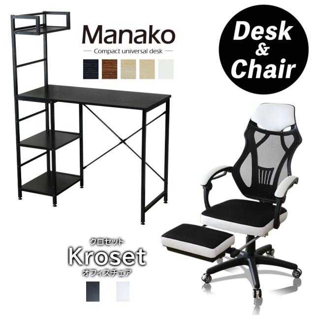パソコンデスク オフィスチェア セット デスク チェア 在宅 テレワーク ラック 収納 メッシュ リクライニング 肘付き ハイバック 低反発 マナコ クロセット2色 tm