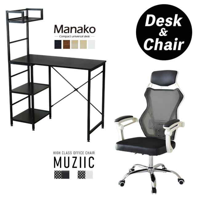 パソコンデスク オフィスチェア セット デスク チェア 在宅 テレワーク ラック 収納 木製 PC リクライニング 肘付き ハイバック 低反発 マナコ ムジーク2色 tm