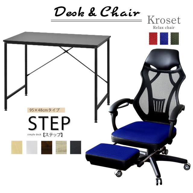 パソコンデスク オフィスチェア セット デスク チェア 在宅 テレワーク 木製 PC メッシュ リクライニング 肘付き ハイバック 低反発 ステップ95 クロセット3色 tm