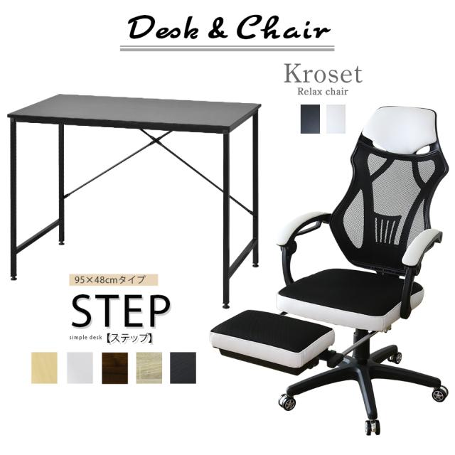 パソコンデスク オフィスチェア セット デスク チェア 在宅 テレワーク 木製 PC メッシュ リクライニング 肘付き ハイバック 低反発 ステップ95 クロセット2色 tm