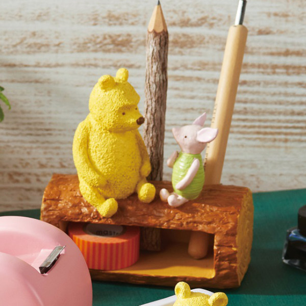 人気者の可愛らしいクラシックデザインのプーさんとピグレットが机の上のこまごましたものを預かってくれます。また切株には穴が3個開いてるので、ペンを立てて収納することもできます。