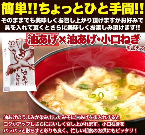 【油あげ】米みそ(国内製造)、食塩、食用植物油脂、わかめ、たん白自己消化物、かつお節調味エキス、油あげ/調味料(アミノ酸等)、酒精、凝固剤、(一部に大豆を含む)
