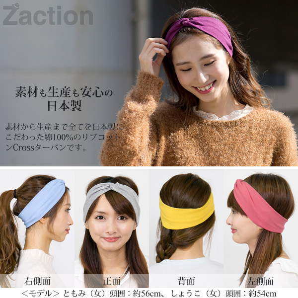 きめ細やかな日本製の綿100%生地を使用したクロスヘアバンドがZactionオリジナルで完成しました。番手の大きな細い糸で出来た生地のため、薄手で肌触りがよく吸水性も高く、お肌に直接触れる商品に適した素材です。また、リブコットン生地は、伸縮性があるので適度なフィット感で快適に過ごすことができ、着け外しもラクにおこなえます。年中使えるベーシックな色から春夏にぴったりな明るい色まで全10色展開です。お洒落にはもちろん、邪魔になる髪の毛をさっとまとめれるので、お家で過ごすルームターバンとしてもオススメです。※小さめのサイズ(頭囲:約54〜56cm)なので、ご注文の際はご注意ください。