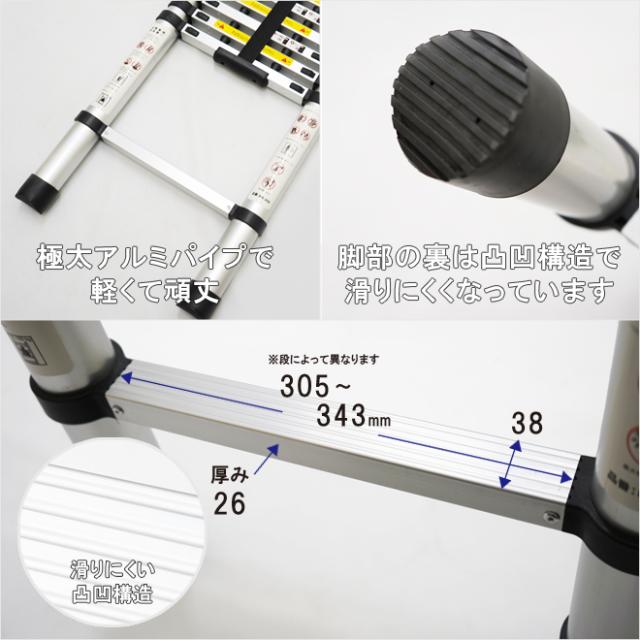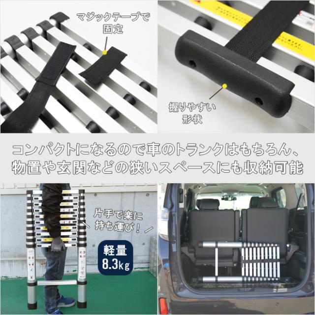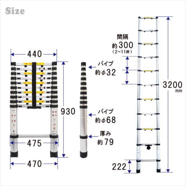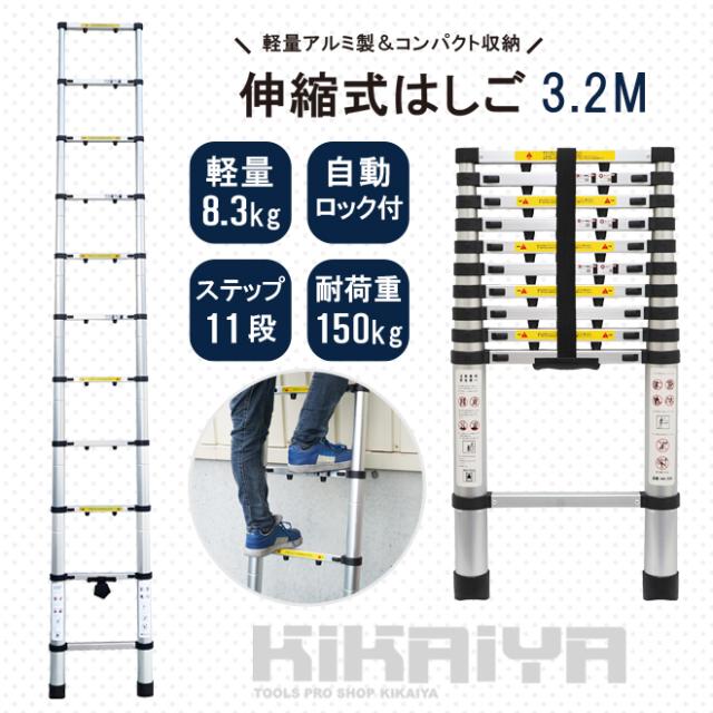 はしご 3.2m 伸縮 アルミ ハシゴ 梯子 11段 150kg 自動安全ロック 滑り止め付き 軽量 コンパクト スーパーラダー 踏み台 3200mm KIKAIYA