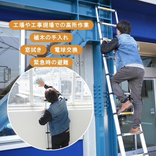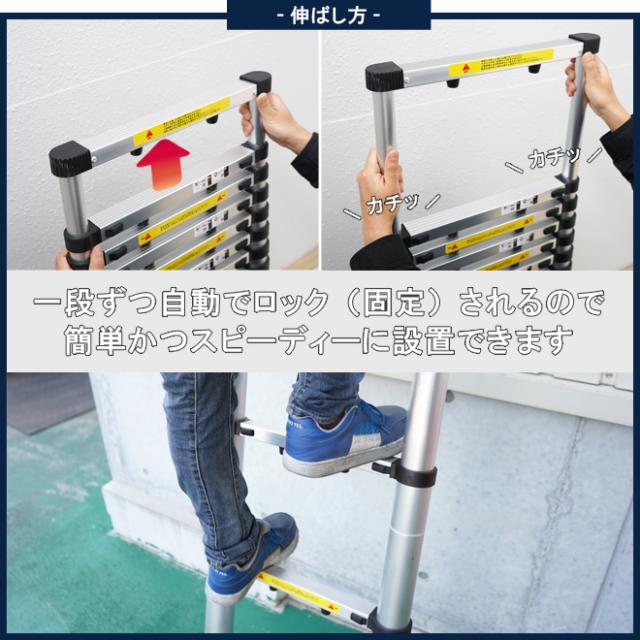 指挟み防止付き!伸縮自在はしご ●極太アルミパイプを使用し、軽くて頑丈! 片手で楽に持ち運びができる、伸縮自在なアルミ製はしご ●最長3.2mまで伸びるハシゴは工場や工事現場での高所作業に最適 ご家庭での植木の手入れや窓拭き・電球交換、緊急時の避難の際にも活躍します ●伸縮式なので一段ずつ引き伸ばしができ、一段ずつ自動でロック(固定)されるので、 簡単かつスピーディーに設置できます ●両手でレバーをスライドする事でロックが解除され、一段ずつ縮みます 各段の間に指挟み防止があるので安心です ●コンパクトになるので、車のトランクはもちろん、物置や玄関などの狭いスペースにも 収納可能 エレベーターにも入り、様々な作業場所で使えます 【ご注意】 ・不安定な場所/滑りやすい場所でのご使用は大変危険ですのでおやめ下さい ・はしごに登る前にステップがロック状態であることを必ず確認して下さい ・使用する際は、はしごを固定するか別の人がはしごを支える等、安全に注意して下さい ・転倒や転落による重大な事故の恐れがありますので、間違った使い方や用途以外の 使い方は行わないで下さい ※本品は新品ですが、伸縮時パイプ等に擦り傷が入る場合がございます 品番:HA-320 |