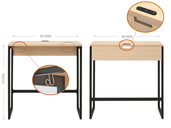 | フック付き 天板下用のフックが1個付いています。取り付け位置は左右お好みで付けていただけます。 | 2口コンセント 天板には2口のコンセントが付いていて、机上でのモバイル端末の充電もスムーズに行えます。また、幕板中央に配線穴があります。 |